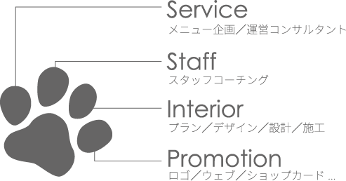店舗デザイン、設計、施工、メニュー企画、ロゴ、ショップカード、名刺、運営コンサルティング、スタッフコーチング、web,snsプロモーション