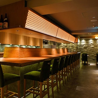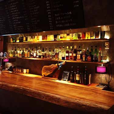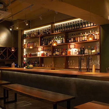 無垢の木のカウンター、テーブルと、温かみのある照明、重厚な音響でコーディネートした、お酒を愉しむ空間。