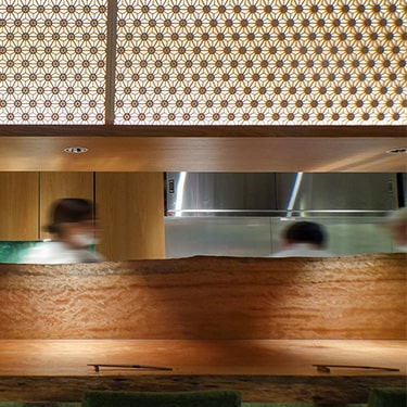 お洒落に、気軽に、贅沢に。フレンチシェフが羊肉料理をご提供。高級感のある桜柄の組子細工の照明が印象的。
